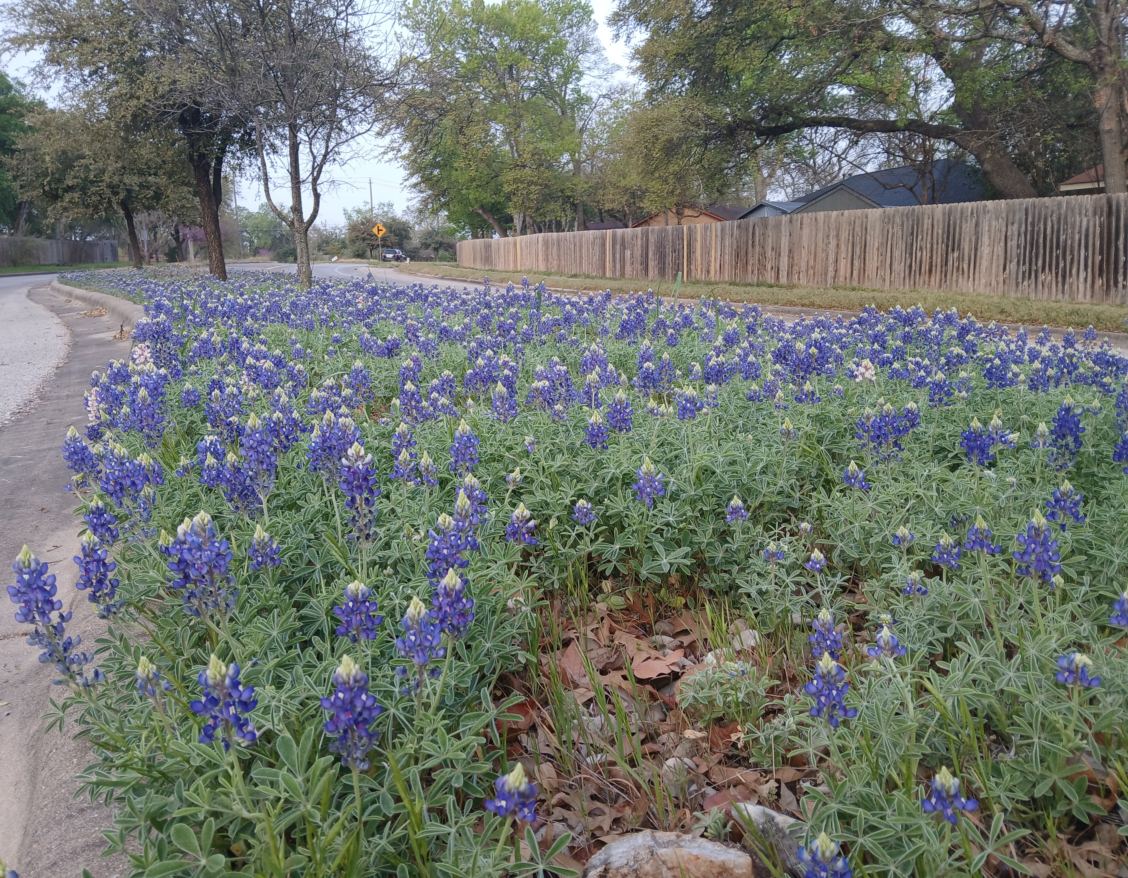 I’ve seen growth and progress each year of my Davis Lane project as the plants’ coverage has spread. This spring’s blooms have been decent (the continuing drought is a mitigating factor) with five or six large pockets of bluebonnets up and down the median. The plants have naturally done their work, but I’ve continued to do the work of redistribution, sharing seeds from places abundant to this place of need.